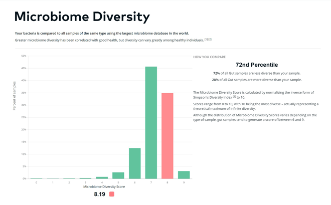 In general, higher gut diversity is associated with better health. My diversity score was 8.19 out of 10 (72nd percentile), which is pretty good, especially considering how many rounds of broad-spectrum antibiotics I had growing up. Interestingly, too much diversity can actually destabilize the gut ecosystem.