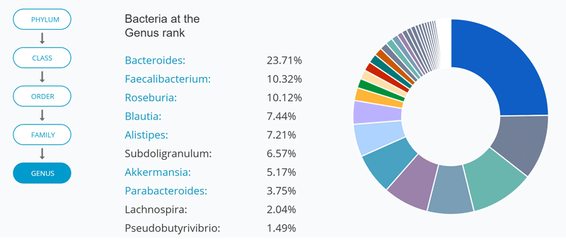 Under the “My Bacteria” section, uBiome Explorer allows you to look at bacterial abundance at different taxonomic levels, with a visual pie chart. You can see my top ten genera below:
