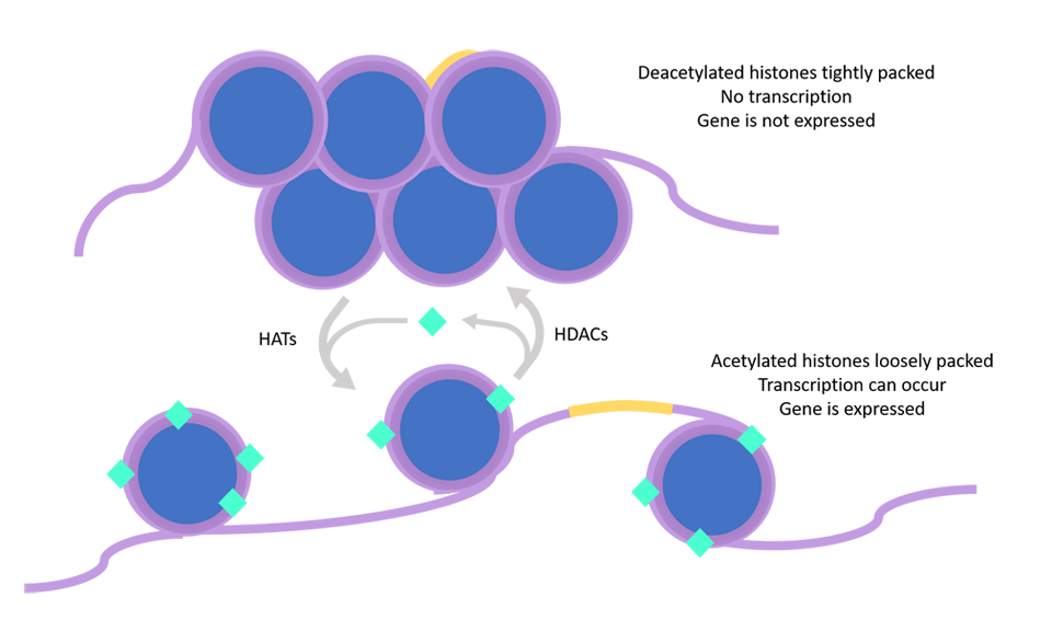 While our genetic makeup is essentially unchangeable, the epigenetics, or expression of our genes, is quite malleable. In the nucleus of every cell in our body, DNA is wound around histone proteins. When the histones of a gene are deacetylated, the histones and their associated DNA tend to pack very tightly. This makes it very difficult for any enzymes to bind to transcribe the message encoded in the DNA. The gene will not be made into a protein, and is functionally “off”. On the other hand, when the histones of a gene are acetylated, the histones and their associated DNA tend to pack more loosely. This allows enzymes to bind to the promoter region of the gene and initiate its transcription. This is the first step towards making a functional protein from the gene.